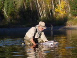 The summer Salmon season starts on June 16th with much of the fishing done by wading, however, boat fishing is still available for those who prefer it to wading. 8-9 wt. rods with floating lines - using both wet and dry flies depending on conditions - is the method used for catching these fresh Wild Atlantic Salmon as they arrive in the system from the sea. In the summer and fall, the Atlantic Salmon are not feeding but take flies out of pure instinct and Salmon up to 30+ lbs. are landed annually on the System. The Miramichi contains a lot of private fishing water so we pride ourselves in offering guests some of the better private water for fishing which produces the best success rate.